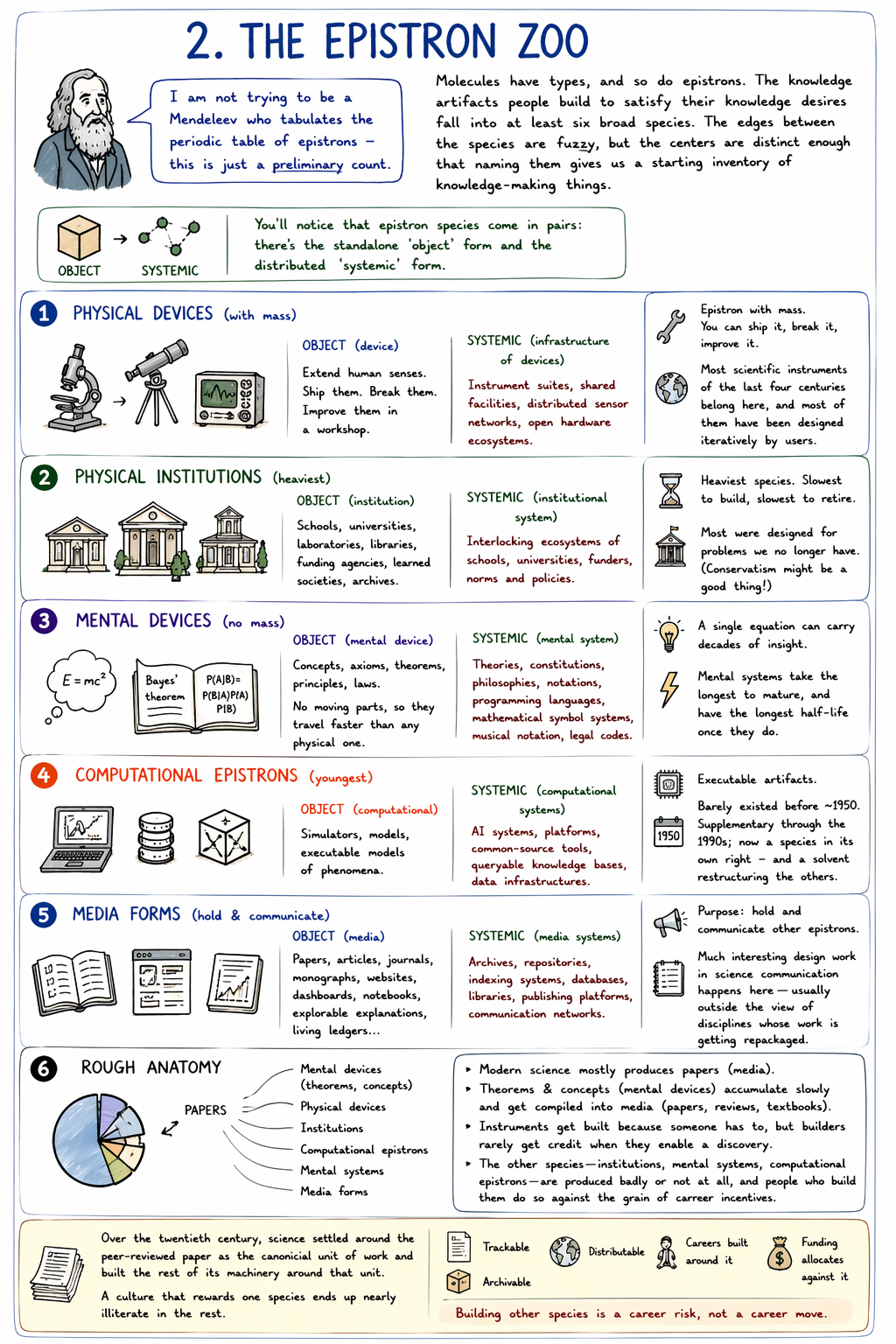 Molecules have types, and so do epistrons. The knowledge artifacts people build to satisfy their knowledge desires fall into at least six broad species. The edges between the species are fuzzy, but the centers are distinct enough that naming them gives us a starting inventory of knowledge-making things.
