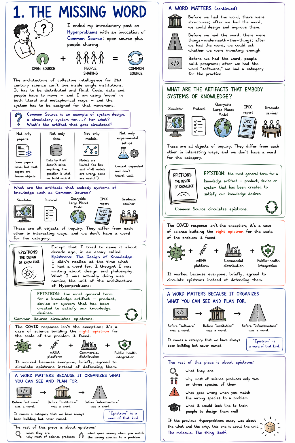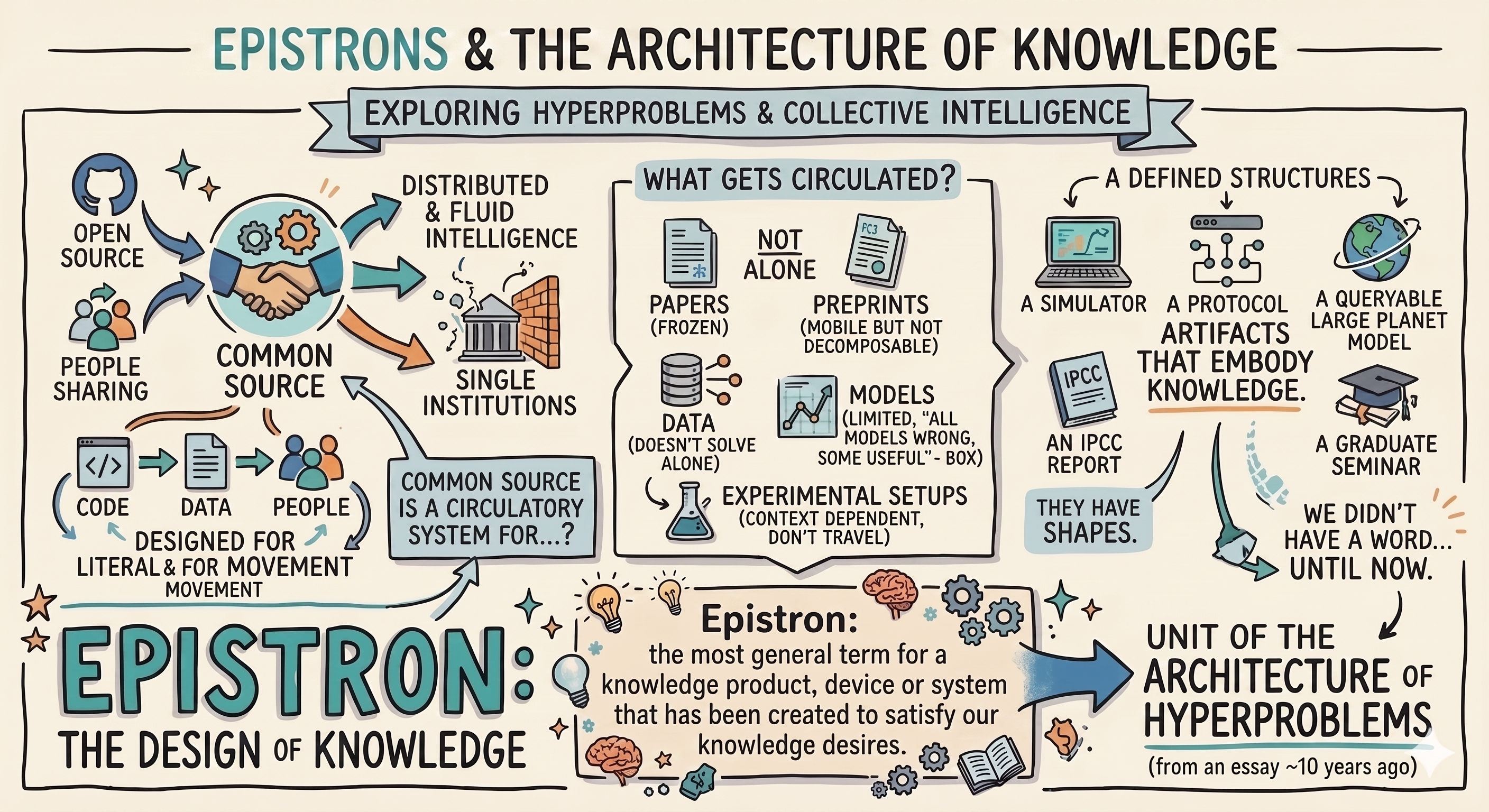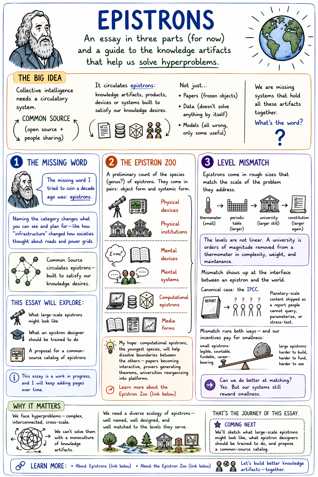 Naming the category changes what you can see and plan for, the way "infrastructure" changed how socities thought about roads and power grids. I had completely set aside my work on Epistrons until I started thinking about hyperproblems last year. Common Source circulates epistrons - knowledge artifacts, products, devices or systems built to satisfy our knowledge desires.