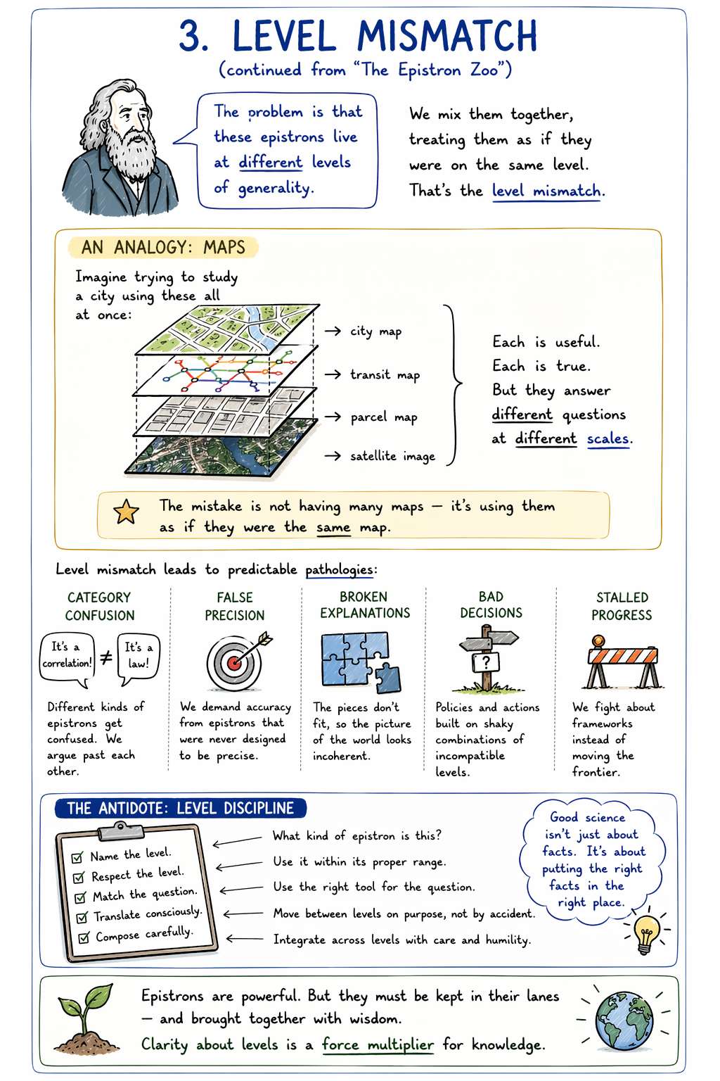 The third section is about level-mismatch. Epistrons come in rough sizes that correspond to the scale of the problem they address. A thermometer is small; a periodic table larger; a university larger still; a constitution larger again. The levels are not linear. A university is several orders of magnitude removed from a thermometer in design complexity, institutional weight, and maintenance burden. Mismatch shows up most sharply at the interface between an epistron and the world. My canonical case is the IPCC: planetary-scale content shipped as an Assessment Report that a farmer in Indonesia cannot query, a municipal planner in Chennai cannot parameterize, a trader in Tokyo cannot stress-test. What we need is something closer to a Large Planet Model with a multimodal UI. Mismatches run the other way too - a university's ethics apparatus can smother a routine experiment - and in the most dangerous direction we aim a tiny epistron at a civilizational problem, as when PageRank made a single algorithm the custodian of human knowledge. The mismatch persists because small epistrons are legible in ways large ones are not: countable, fundable, career-bearing. Can we do better at matching? Yes. But our incentive systems still pay for smallness.
